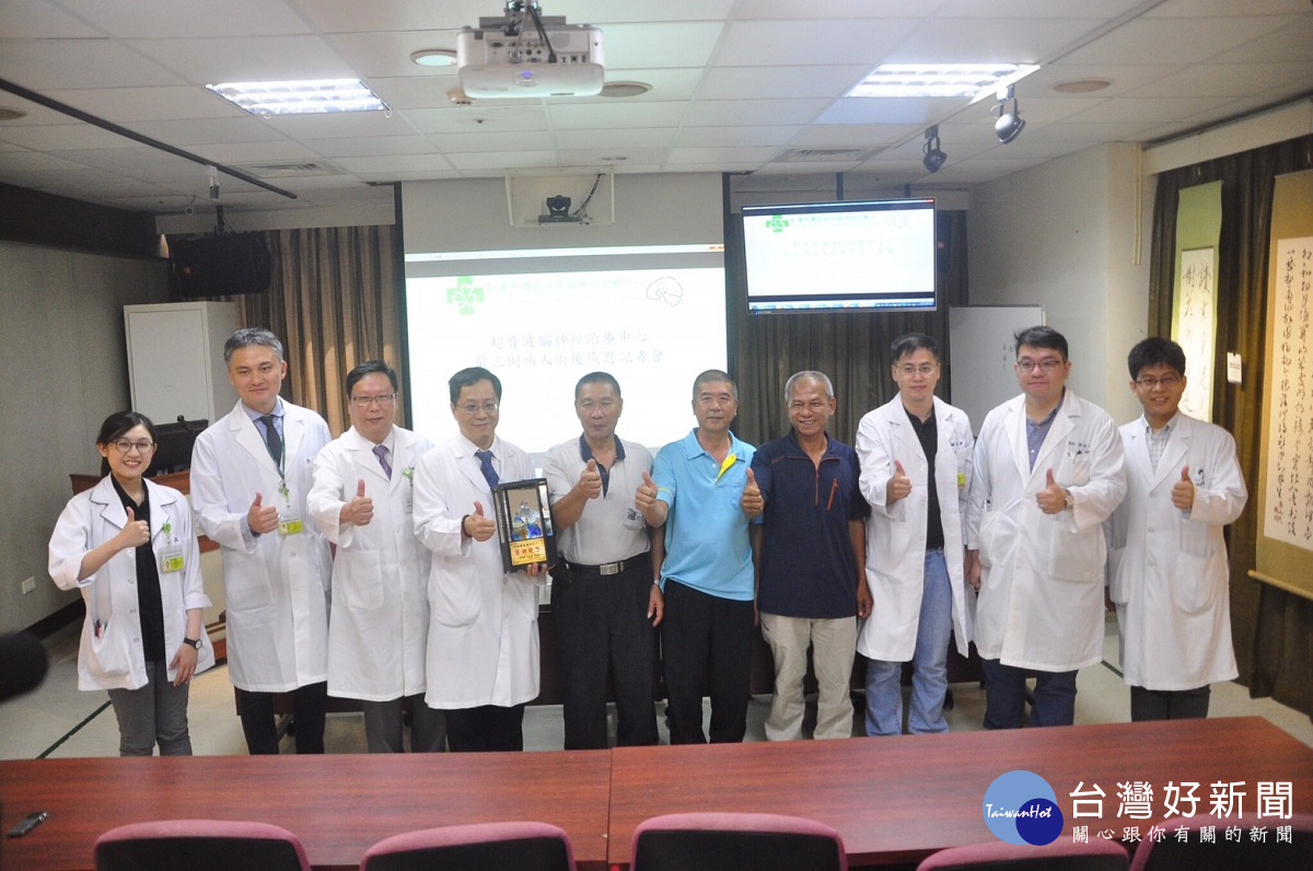 經彰濱秀傳醫療團隊以「醫視特超音波腦神經治療儀」,成功治療三例原發性震顫病人,回醫院感謝醫療團隊和醫護人員。張維傑(左二)、葉永祥院長(左三)、魏誠佑(左四)、孫先生、黃先生、粘先生。