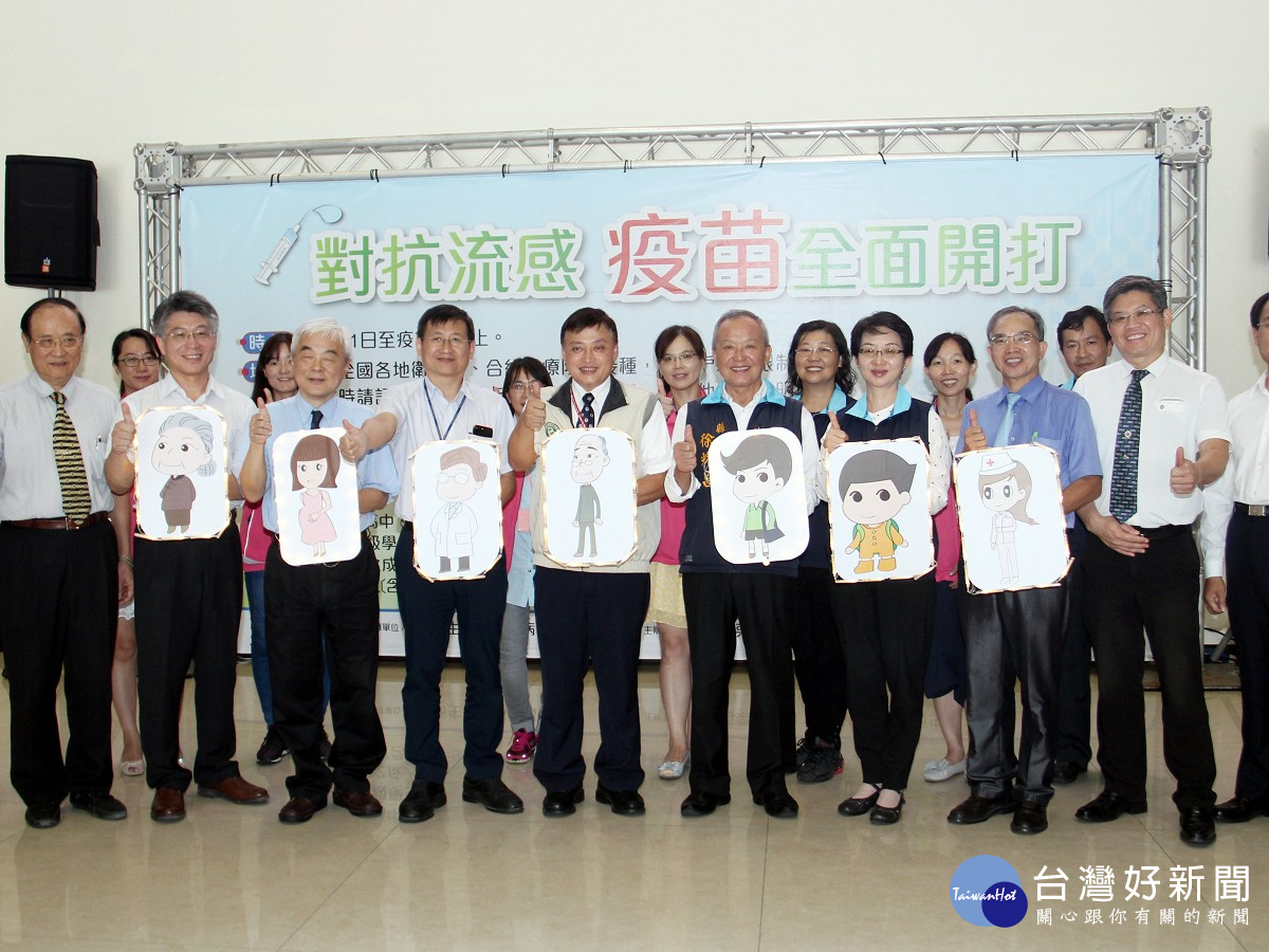 衛生局9月30日在縣府大廳召開「流感疫苗全面開打」記者會,由縣長徐耀昌、疾病管制署北區管制中心主任巫坤彬、苗栗縣醫師公會理事長吳順國等人率同縣內各大醫院院長、衛生所主任,一同呼籲鄉親作伙打擊流感、顧健康。
