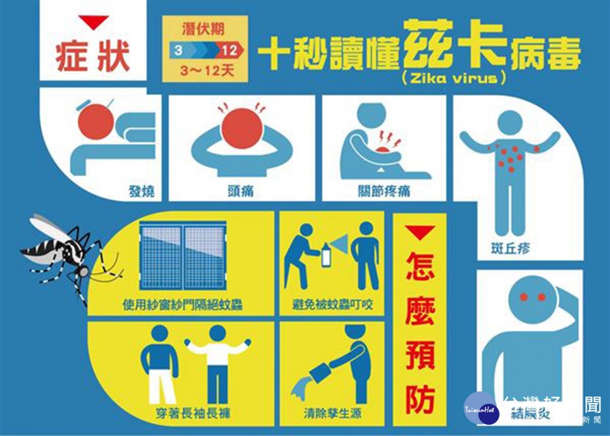 疾管署呼籲,一般成人感染茲卡病毒後症狀輕微,孕婦感染茲卡病毒後可能導致胎兒小頭畸形或死亡,提醒孕婦及計劃懷孕婦女暫緩前往流行地區;民眾如需前往,應做好防蚊措施,著淺色長袖衣褲、皮膚裸露處塗抹衛福部核可的防蚊藥劑、住在有紗窗、紗門或空調的房舍等。(圖/衛福部疾管署提供)