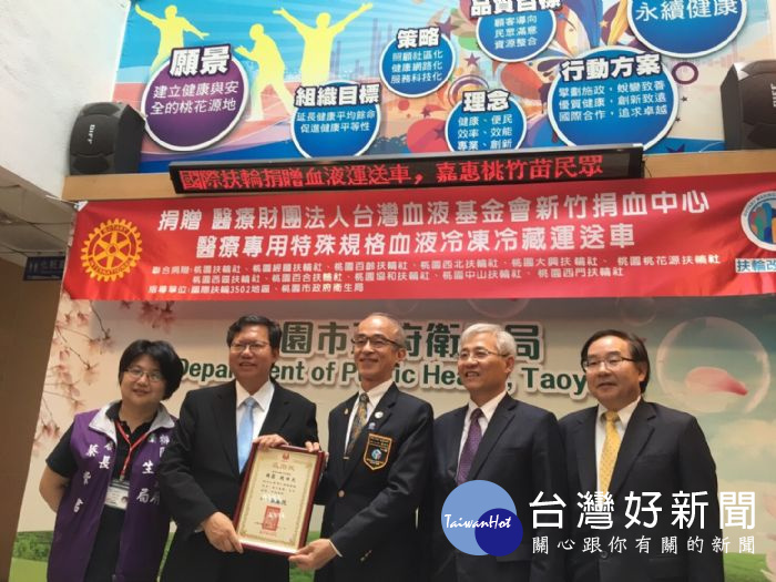 桃園市長鄭文燦及王副市長2日出席國際扶輪3502地區捐贈血液冷凍冷藏運送車給新竹捐血中心之捐贈典禮,與台灣血液基金會執行長魏昇堂一同頒發感謝狀給扶輪社。台灣血液基金會負責統籌分配全臺灣的捐血、血液檢驗與領血業務,轄下共有6個捐血中心,新竹捐血中心為該基金會所設第6個捐血中心,主要服務桃竹苗365萬民眾,提供不虞匱乏的醫療用血需求。