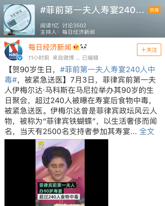 前段時間,微博熱搜榜里,話題#菲律賓第一夫人壽宴240人中毒#再次讓食物中毒成為了萬眾焦點。在菲律賓前第一夫人伊梅爾達·馬科斯的90歲生日聚會上,有超過240人被曝壽宴后食物中毒,被緊急送醫。