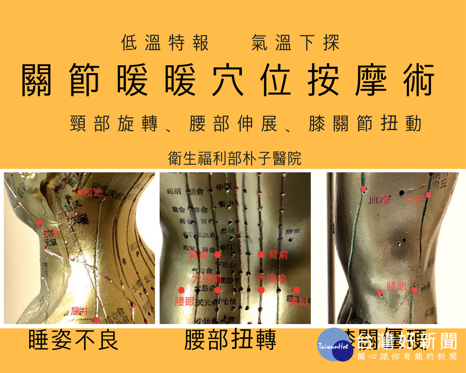 朴子醫院中醫科李昌諴博士表示,對於很多民眾,長期處於睡眠姿勢不良,加上沒有好的支撐,造成頸肩部壓迫及腰部過度扭轉,整個晚上下來,頸肩關節與腰部便有不適感,有時頸部轉動困難、手麻、甚至手臂抬不起來做這個舒緩運動很有幫助。關節暖暖穴位按摩術主要動作是,「頸部旋轉、腰部伸展、膝關節扭動」,穴位及附近的肌肉輕輕揉壓也可以舒緩這些不適症狀,例如頸肩穴位「風池、肩井、天容」。腰部痠痛與膝關僵硬的民眾可以用以下穴位「腰眼、腎俞、大腸俞」,膝關節 「膝眼、梁丘、血海」,可以利用V形手勢與爪形手勢,進行穴位按摩都可以起到不錯的舒緩作用。