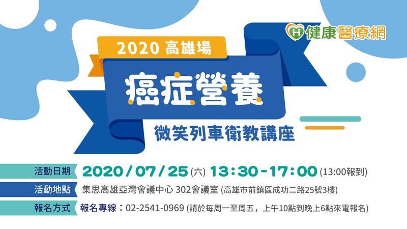 為傳達正確的癌症營養與衛教知識,台灣腸癌病友協會將於07/25(六)下午於高雄集思亞灣會議中心舉辦免費《癌症營養》衛教講座,邀請權威腸癌與乳癌專科醫師、營養師及護理師分享癌症治療方程式、營養相關訊息以及如何克服抗癌期間的副作用~邀請民眾一起共襄盛舉!報名請洽02- 2541-0969,或上網搜尋台灣腸癌病友協會官網及臉書專業報名。