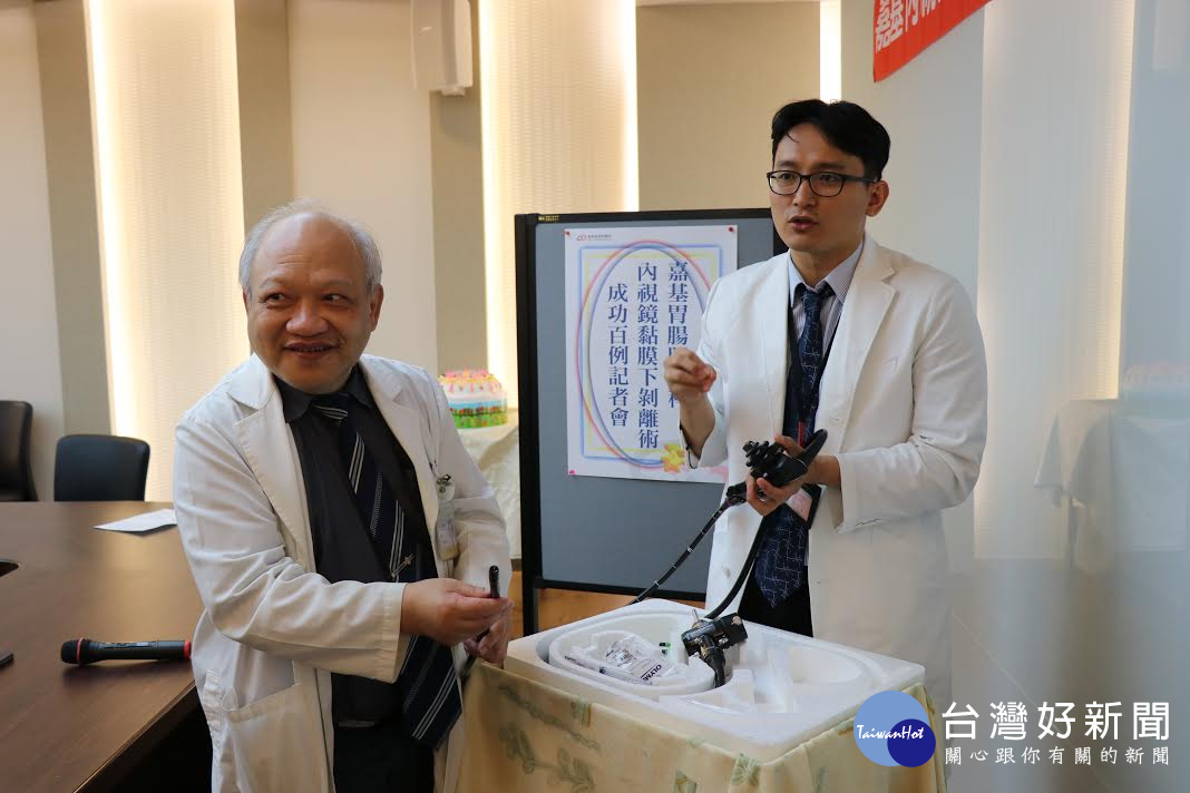 圖1.嘉基陳誠仁院長(左)胃腸肝膽科周莒光醫師(左)說明內視鏡黏膜下切除術器械