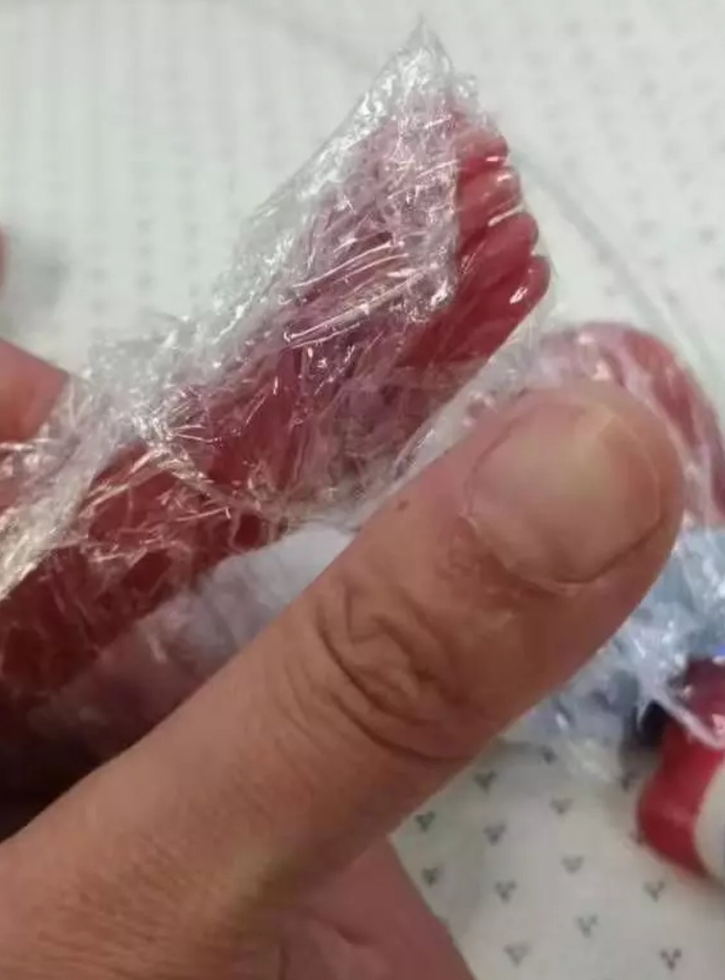 我到了新生兒科,一群人在搶救台上等着,溫暖的光線照在我身上,我還被套在保鮮膜里,戴着個大帽子。她們給我稱了體重:800g——我才1斤6兩,皮膚像膠腖一樣,大腿還沒成人的手指粗,太袖珍了!