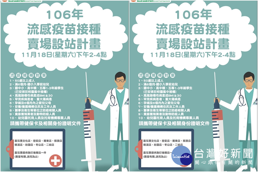又將進入流感病毒肆虐的高峰期,宜蘭縣政府衛生局首度與生鮮超市業者喜互惠合作,在8家門市設置流感疫苗接種站,於11月18日下午2時到4時,由衛生所醫療團隊進駐,提供符合公費流感疫苗接種的民眾免費施打,讓鄉親在購物之餘,還享有公費流感疫苗接種服務,業者亦將對打完疫苗的民眾送上精美贈品。