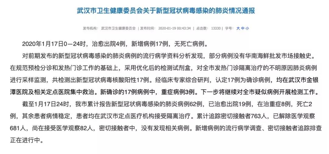 自2019年12月31日武漢市衛生健康委員會第一次發布關於不明原因肺炎的通報至今,武漢市累計報告新型冠狀病毒感染的肺炎病例62例,已治癒出院19例,在治重症8例,死亡2例。香港疑似病例最多,截至1月18日,共90例,其中76例已出院,未出院的均為1月14日後才報告的病例。另日本報告1例,泰國報告2例。