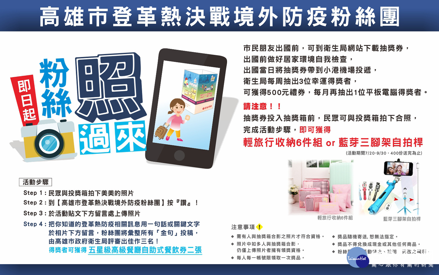 為喚起市民的防疫意識及警覺度,近期高雄市決戰境外加強防疫措施,臉書成立登革熱決戰境外防疫粉絲團,即日起至8月31日推出「粉絲拍美照」、「防疫金句」活動,邀請市民朋友出國前至家裡附近的衛生所(或衛生局網頁下載)索取抽獎券,完成居家環境檢查,出國當日於小港機場出境大廳的抽獎箱投入抽獎券前,與抽獎箱拍下合照,完成後至粉絲團按讚及於活動貼文下方留言處上傳照片,即可獲得輕旅行收納6件組或藍芽自拍桿;並可把您知道的登革熱防疫相關訊息用一句話或關鍵文字於相片下留言,粉絲團將彙整所有「金句」投槁,衛生局評審出佳作三名,每人獲得五星級高級餐廳自助式餐飲券2張。