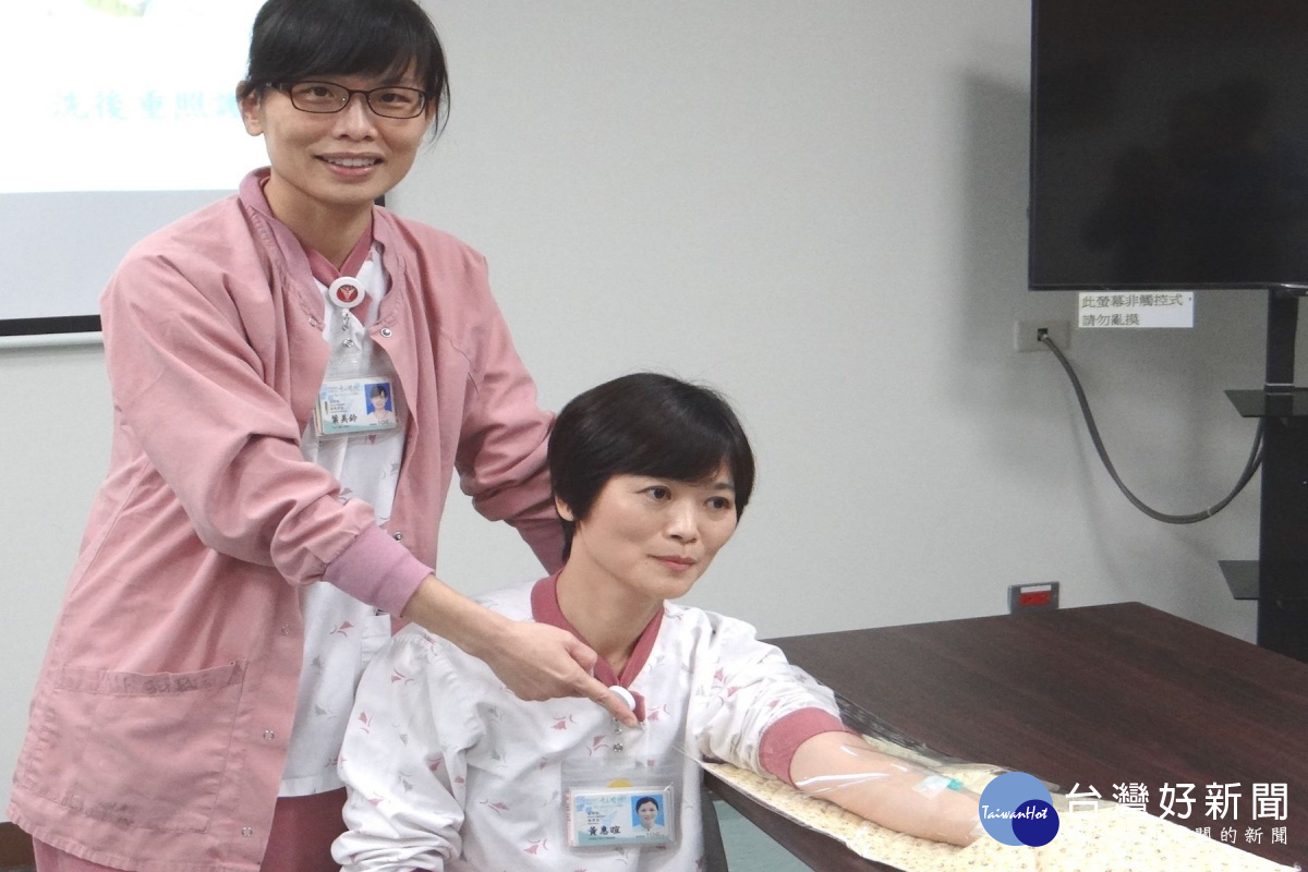 護理部血液透析室護理長黃惠暄(右)親自示範,副護理長葉美鈴解說可以DIY的廔管透明保暖套。