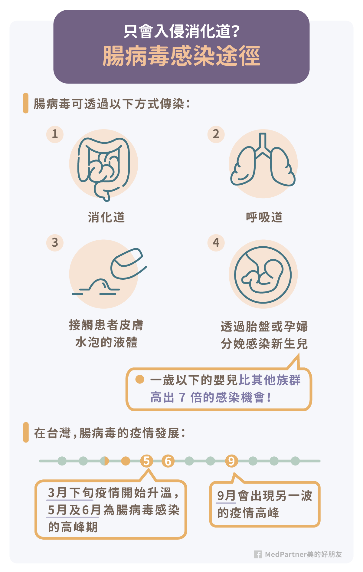 為了增進大家對腸病毒的正確認識,MedPartner 美的好朋友團隊醫師們整理了相關文獻,希望透過這篇文章來完整分析腸病毒如何感染我們人體?腸病毒症狀有哪些?以及腸病毒如何預防及治療?希望大家可以花幾分鐘看完,讓自己能夠更有能力保護及照顧自己的孩子。