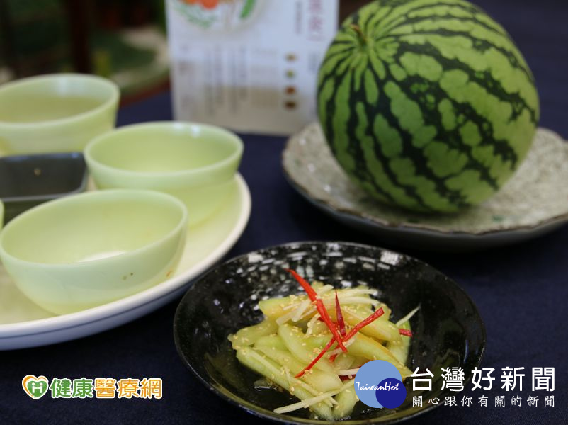 以「當季食材」和「減少廚餘」的概念,花蓮慈濟醫院營養師林雨柔利用夏日常見的消暑水果「西瓜」,吃完果肉後將平日忽略丟棄的果皮變身成可口美味的涼拌菜──芝麻西瓜皮。廚師伍麗雪分享製作芝麻西瓜皮小訣竅,西瓜皮加鹽脫水多,記得切絲時不要切太細,果肉不需完全去除乾淨,保留一點點果肉,吃起來更有西瓜香甜的味道。