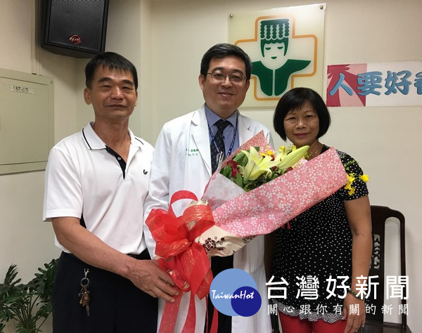 病患到院贈花感謝副院長馮逸卿等醫療團隊細心的檢查與用心的治療。(記者陳昭宗拍攝)